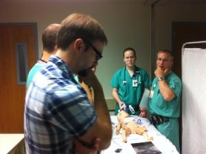 Here's how it worked: Each team ran two adult cases (1-motorcycle collision victim with pneumothorax and hemoperitoneum; 2-shock with both cardiogenic and septic components) and two pediatric cases (1-dysrhythmia, atrial fibrillation with WPW and subsequent V fib; 2-malrotation with volvulus). Debriefing sessions followed each case.